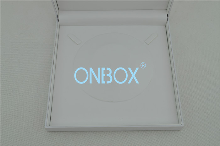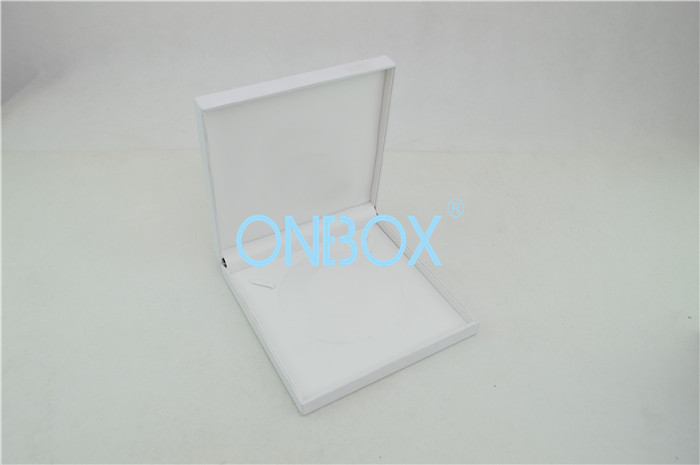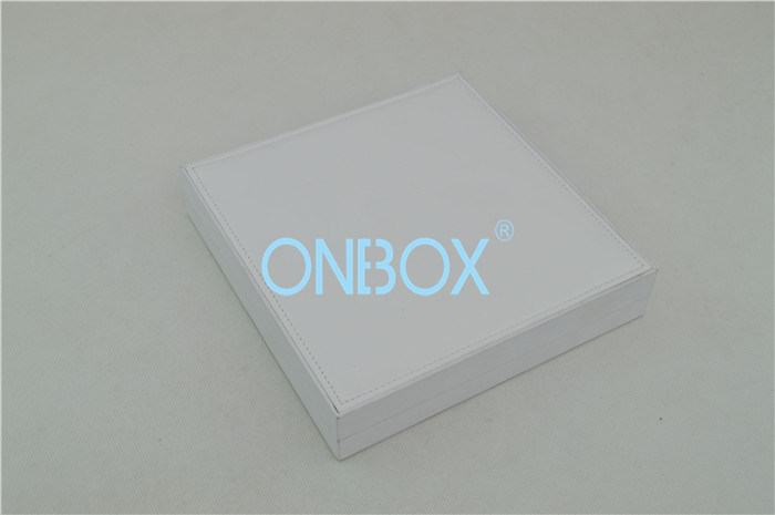 a. Boîte en plastique avec le papier d'art blanc de haute qualité extérieur et dessus en similicuir blanc avec des stitchings élégants ;